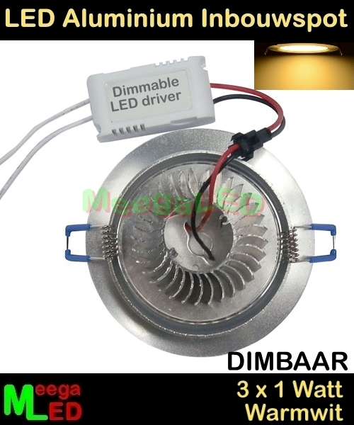 • LED DIMBARE Aluminium inbouwspot plafondspot INB3x1W - warmwit (2900K) De LED spot / inbouwspot is gemaakt van duurzaam aluminium en de LEDspot is voorzien van 3 x 1 watt Hi Power LED in de kleur warmwit - 2900K. Door het gebruik van de nieuwe PMMA Lens in deze LED inbouwspots is het uiterlijk vergelijkbaar met een halogeenspot en is dus het hele lens oppervlak verlicht Deze LEDinbouwspot kan direct op 230V met een normale dimmer worden aangesloten Inbouwmaten: - buiten: 86mm - binnen: 50mm - boorgat: 70mm - hoog: 40mm Levering bestaat uit: - LED Aluminium inbouw spot INB3x1W; - LED trafo / driver 230V - DIMBAAR; - LED kleur: Warmwit (2900K) - Lumen: 270lm (= 30-35watt halogeen) - DIMBAAR Voor deze 3W LEDspot in niet dimbare versie: zie mijn overige advertenties Deze LEDinbouw spot is ook geschikt voor inbouw in uw badkamer, onder uw luifel, dakoverstek of carport. Meegaled prijs: € 24,45 - Nu voor € 14,45 p.s. Incl. Factuur met BTW - Excl. Verzendkosten