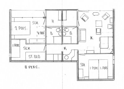 Indeling: hal, 2 badkamers met douche en wc, woonkamer met tv/dvd met ned. zenders, zeer compleet ingerichte keuken (vaatwasser) en 3 slaapkamers, 1x 2 pers.en 2x 3 pers.