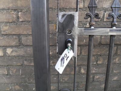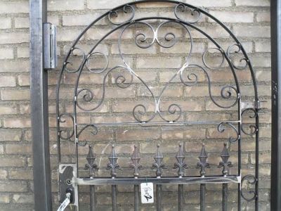 • onbehandelde smeedijzeren poort van 1.80m hoog en een doorgang van ruim 90 cm. kompleet met hang en sluitwerk ( geen klink) en 2 palen die de grond in moeten. totale breedte incl palen is zo n 1,10m. behandeltip: laten roesten en dan met hammeite schilderen/spuiten.